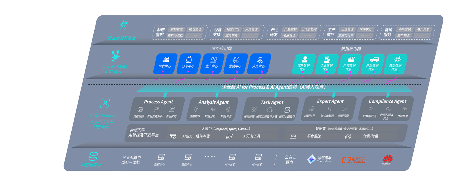 端到端的一站式AI工作空间深度融合了从企业战略规划到日常经营的全流程业务板块,,定向解决车企内部领域多、、、、部门多、、、链条长、、场景碎片化等难题,,支持车企快速构建以AI为核心的生产力写作体系,,实现任务执行与AI能力的无缝集成与交互