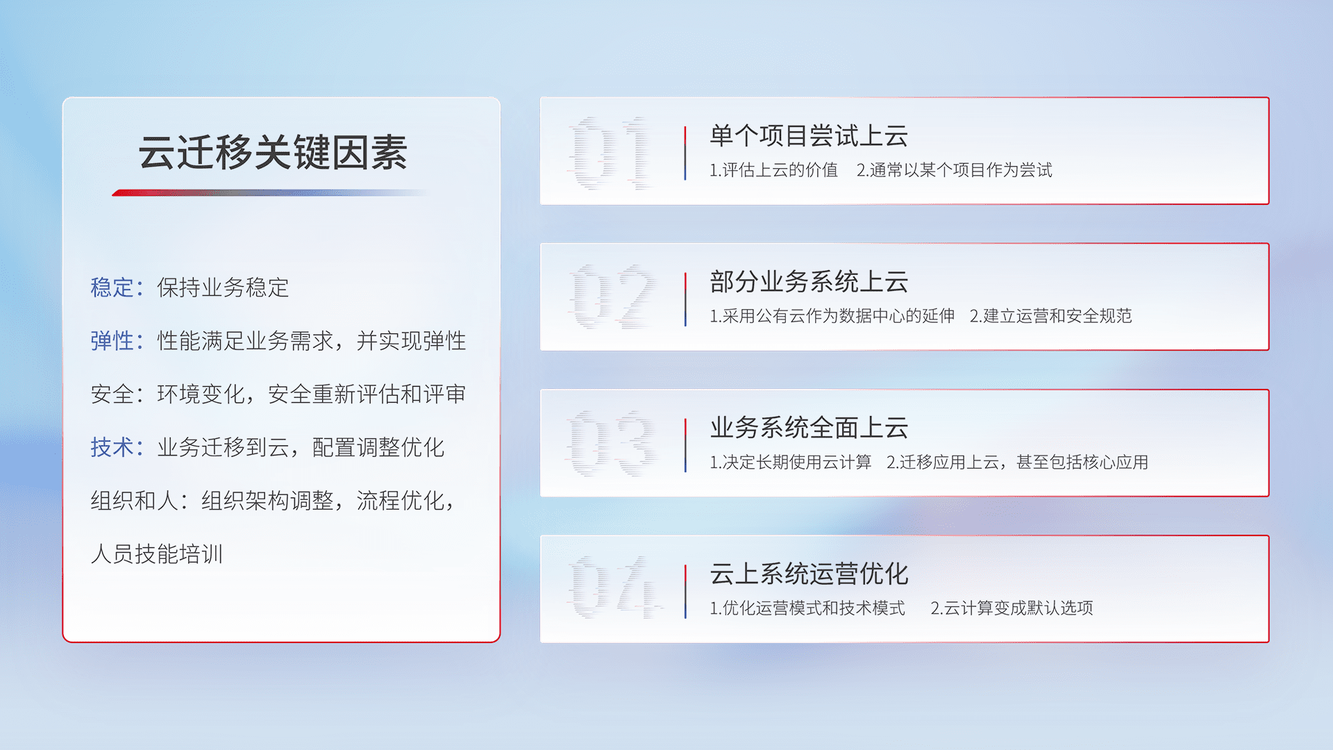 结合实际业务,,,从规划设计、、、云平台选型、、云原生改造、、、、数据迁移、、、集成交付,,迁移全过程为客户识别最佳上云路径,,,,做好风险识别管理,,,,设计网络架构、、、、身份权限、、、安全审计合规、、操作审计、、日志审计、、监控告警策略、、、多站点容灾设计等,,,,对云上基础设施进行整体规划,,提升IT治理水平,,以满足弹性、、高可用、、、高性能的需求。。。。